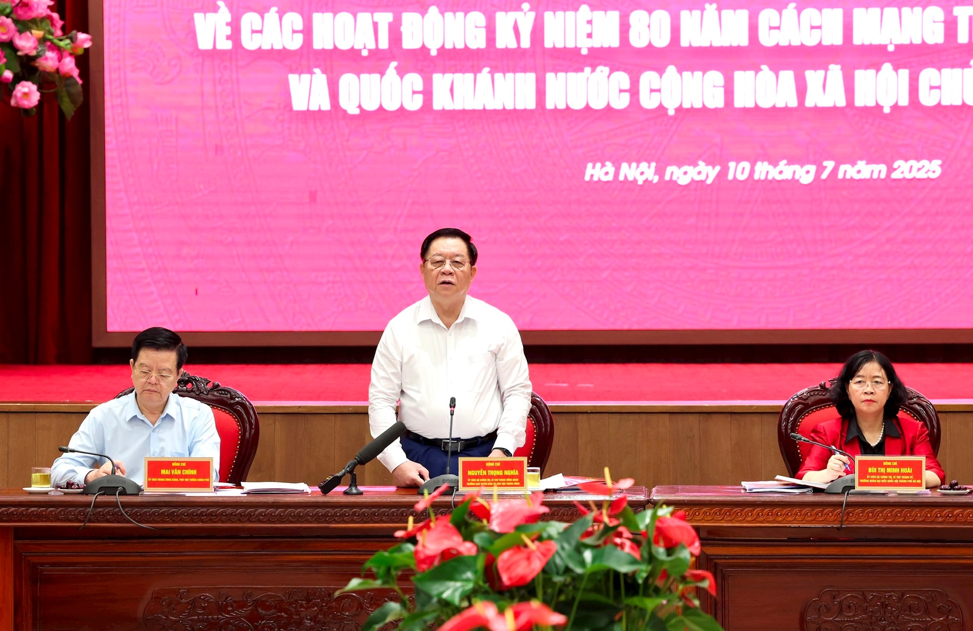 Báo cáo tại hội nghị, Phó Chủ tịch UBND thành phố Hà Nội Vũ Thu Hà cho biết, bám sát sự chỉ đạo của Ban Chỉ đạo Trung ương và Ban Tuyên giáo và Dân vận Trung ương, Thành ủy Hà Nội đã ban hành Chỉ thị số 35-CT/TU vào ngày 5-9-2024, chỉ đạo toàn diện các cấp ủy Đảng, chính quyền và hệ thống chính trị tổ chức các hoạt động kỷ niệm 80 năm Cách mạng Tháng Tám, Quốc khánh 2-9 và các ngày lễ lớn trong năm 2025. UBND thành phố cũng đã ban hành Kế hoạch số 158/KH-UBND, chỉ đạo các sở, ngành triển khai nghiêm túc 3 nhiệm vụ chủ trì, 8 nhiệm vụ phối hợp và 21 nhiệm vụ do thành phố chủ động thực hiện. Thành phố Hà Nội đã hoàn thiện và được Trung ương phê duyệt Đề án tổng thể tổ chức các hoạt động kỷ niệm (Quyết định số 12-QĐ/BCĐTW ngày 10-6-2025).