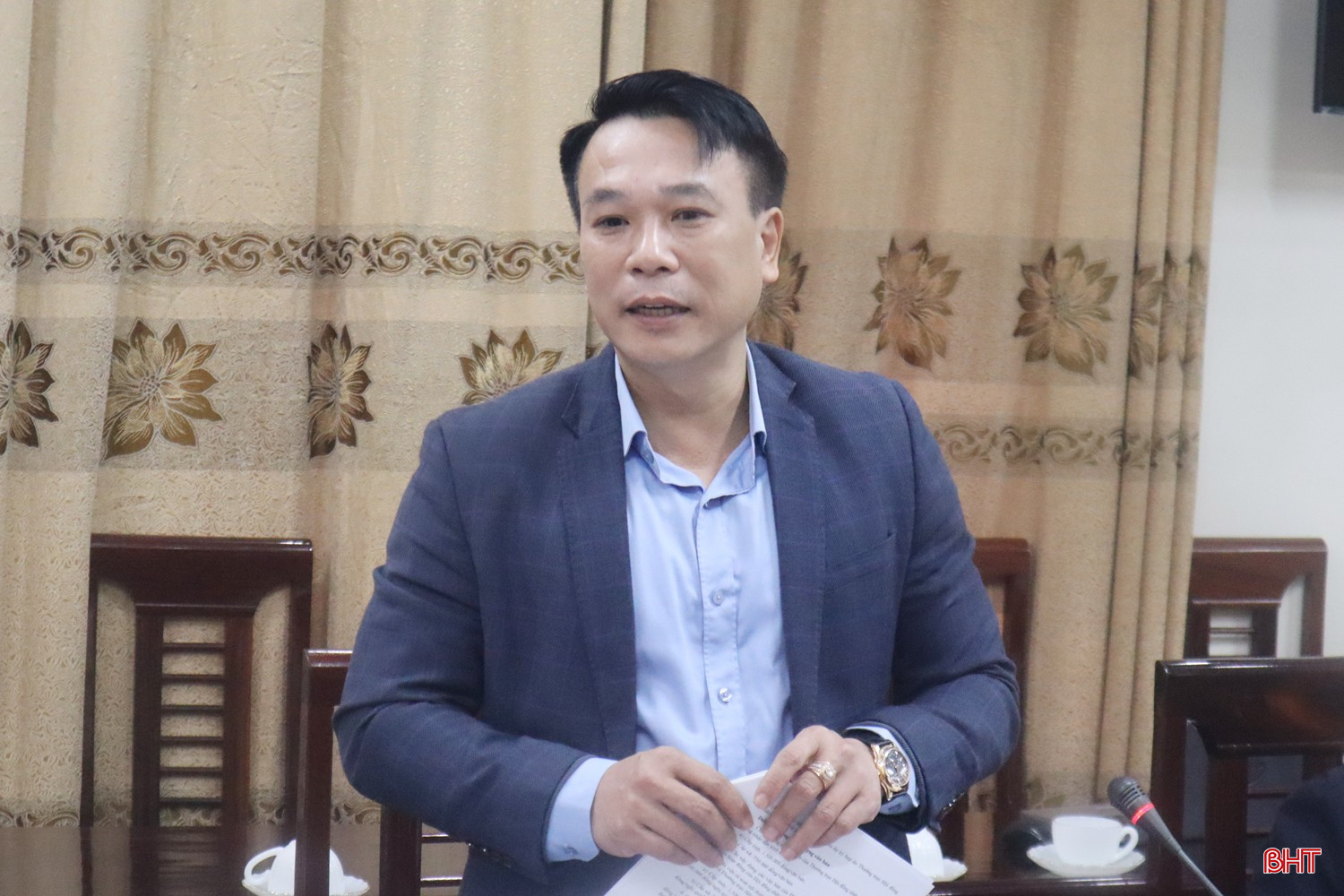 Chánh Văn phòng Đoàn ĐBQH và HĐND tỉnh Nguyễn Huy Hùng báo cáo tại cuộc họp.