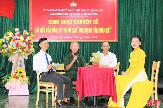 Buổi sinh hoạt chuyên đề về bài viết “Sức mạnh của đại đoàn kết” của đồng chí Tổng Bí thư Tô Lâm tại nhà văn hóa thôn Kim Tân (xã Hồng Lộc) diễn ra trong không khí trang nghiêm mà vui tươi, gần gũi với sự tham dự của lãnh đạo Ủy ban MTTQ tỉnh, lãnh đạo địa phương và đông đảo bà con Nhân dân.