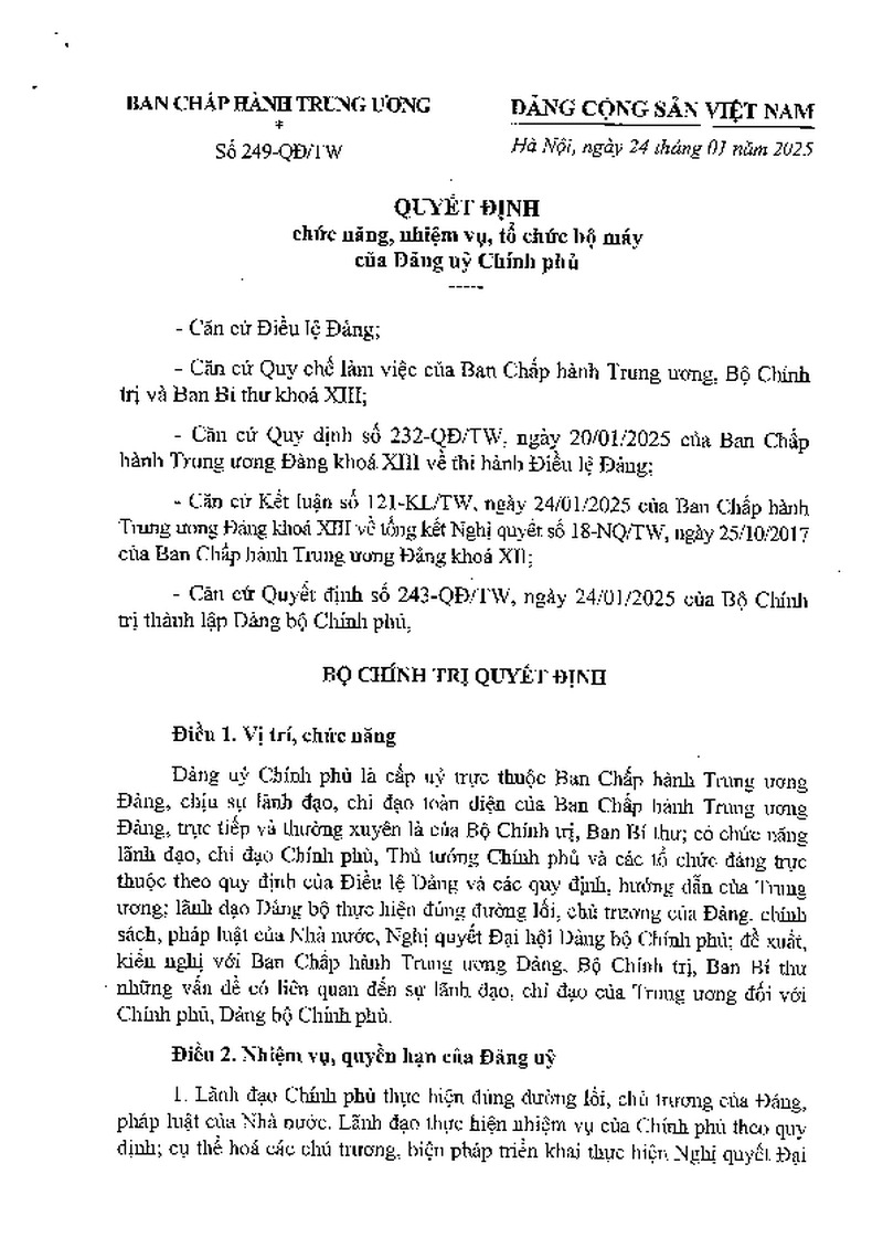 Quyết định số 249-QĐ/TW ngày 24/01/2025 của Bộ Chính trị về chức năng, nhiệm vụ, tổ chức bộ máy của Đảng ủy Chính phủ