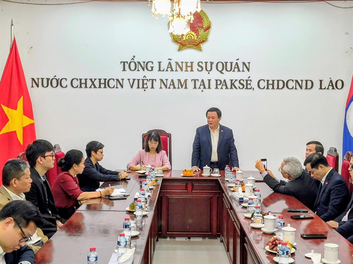 Dự buổi làm việc có PGS,TS Đoàn Minh Huấn, Ủy viên Trung ương Đảng, Phó Bí thư thường trực Đảng ủy, Phó Giám đốc thường trực Học viện Chính trị quốc gia Hồ Chí Minh; GS,TS Tạ Ngọc Tấn, Phó Chủ tịch thường trực Hội đồng Lý luận Trung ương; PGS,TS Nguyễn Mạnh Hùng, Phó Giám đốc Học viện Chính trị quốc gia Hồ Chí Minh, Phó Chủ tịch Hội đồng Lý luận Trung ương và các thành viên đoàn công tác; cùng toàn thể cán bộ, nhân viên Tổng Lãnh sự quán Việt Nam tại Pakse.