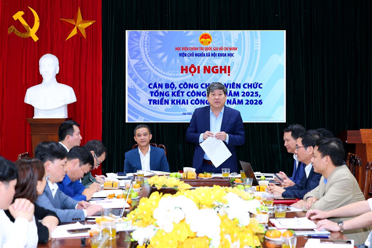 Báo cáo các mặt công tác năm 2025 và phương hướng nhiệm vụ năm 2026, TS Nguyễn Văn Quyết, Phó Bí thư, Phó Viện trưởng Viện Chủ nghĩa xã hội khoa học nhấn mạnh, năm 2025, với tinh thần đoàn kết, nỗ lực và chủ động đổi mới, Viện Chủ nghĩa xã hội khoa học đã hoàn thành toàn diện các nhiệm vụ về đào tạo, bồi dưỡng, nghiên cứu khoa học và hợp tác quốc tế; góp phần nâng cao chất lượng giảng dạy, nghiên cứu và tham mưu chiến lược của Học viện Chính trị quốc gia Hồ Chí Minh.