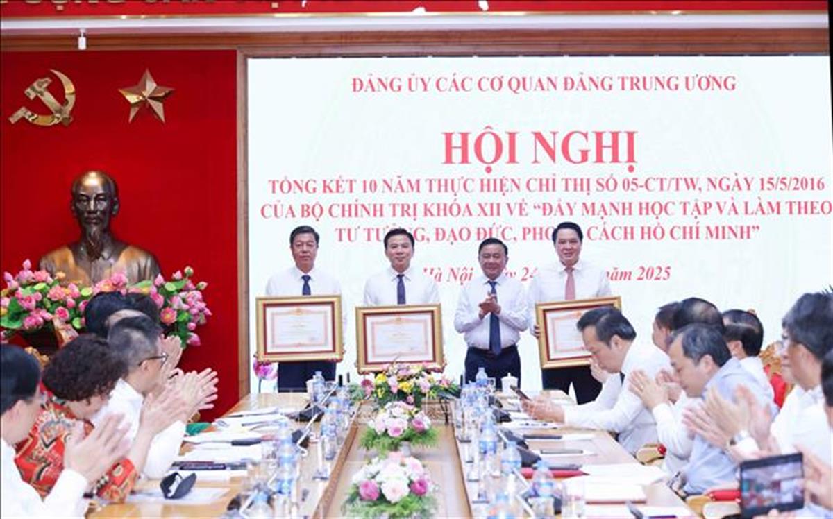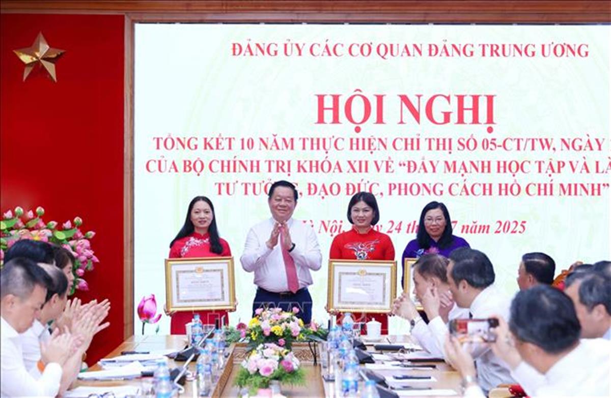 Đồng chí Lê Hoài Trung và các đồng chí Phó Bí thư Đảng ủy các cơ quan Đảng Trung ương trao Bằng khen của Ban Thường vụ Đảng ủy các cơ quan Đảng Trung ương, giai đoạn 2016-2025, tặng 10 tập thể và 16 cá nhân tiêu biểu xuất sắc trong học tập và làm theo tư tưởng, đạo đức, phong cách Hồ Chí Minh.
