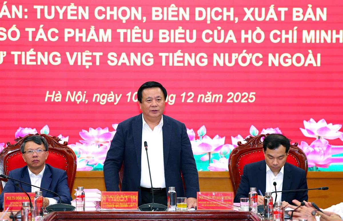 Báo cáo tổng kết Đề án, PGS,TS Nguyễn Mạnh Hùng, Phó Giám đốc Học viện Chính trị quốc gia Hồ Chí Minh, Phó Chủ tịch Hội đồng Lý luận Trung ương cho biết, để đáp ứng nhu cầu nghiên cứu, tìm hiểu về Chủ tịch Hồ Chí Minh của đông đảo đồng bào Việt Nam ở nước ngoài và bạn bè quốc tế, lan tỏa giá trị di sản Hồ Chí Minh ra thế giới; tiếp tục thực hiện Nghị quyết của Tổ chức Giáo dục, Khoa học và Văn hóa Liên hợp quốc (UNESCO) tôn vinh Hồ Chí Minh là “Anh hùng giải phóng dân tộc, Nhà văn hóa kiệt xuất”; thực hiện chỉ đạo của Ban Bí thư Trung ương Đảng, ngày 3/8/2021, Giám đốc Học viện Chính trị quốc gia Hồ Chí Minh đã ra Quyết định số 4043/HVCTQG, phê duyệt tổ chức chủ trì, cá nhân chủ nhiệm, thời gian và kinh phí thực hiện Đề án khoa học cấp bộ trọng điểm: “Tuyển chọn, biên dịch và xuất bản bộ sách một số tác phẩm tiêu biểu của Hồ Chí Minh từ tiếng Việt sang tiếng nước ngoài”.