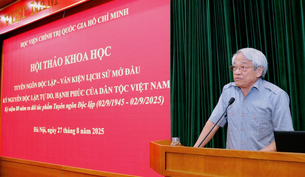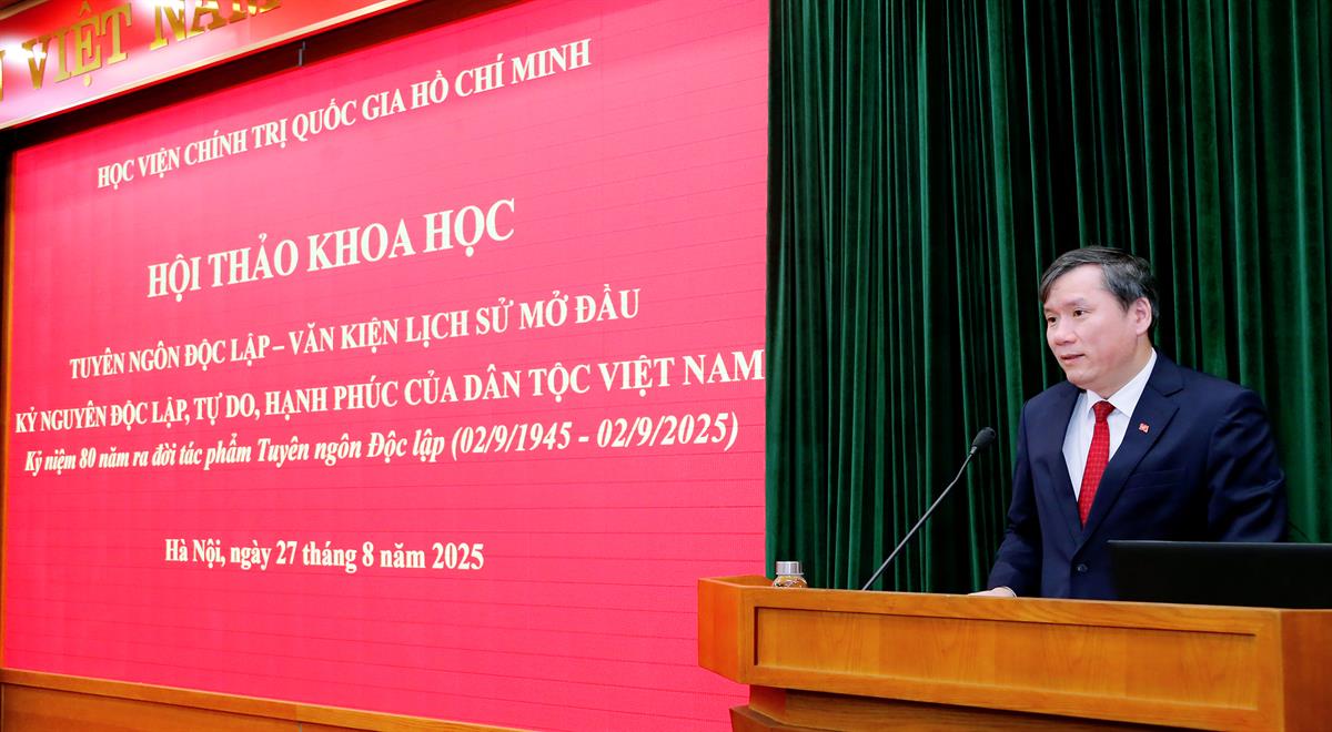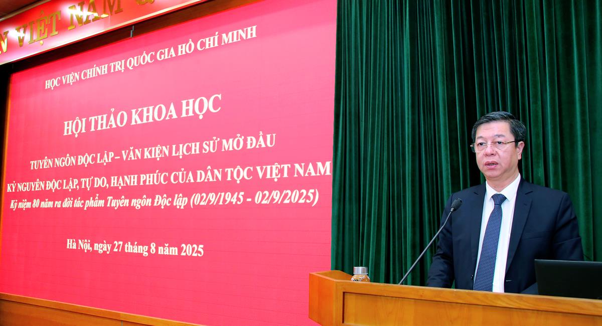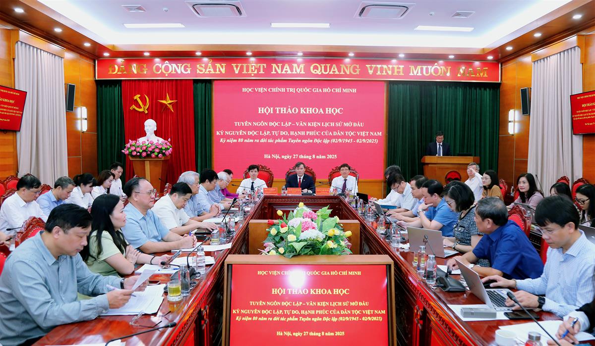 Nằm trong các hoạt động thiết thực kỷ niệm 80 năm Cách mạng Tháng Tám thành công và ngày Chủ tịch Hồ Chí Minh đọc Tuyên ngôn Độc lập (02/9/1945 - 02/9/2025), sáng ngày 27/8/2025, tại Hà Nội, Học viện Chính trị quốc gia Hồ Chí Minh trang trọng tổ chức Hội thảo khoa học với chủ đề: “Tuyên ngôn Độc lập – Văn kiện lịch sử mở đầu kỷ nguyên độc lập, tự do, hạnh phúc của dân tộc Việt Nam”.