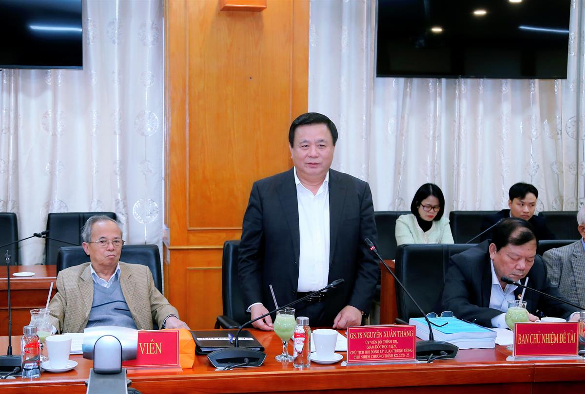 GS,TS Nguyễn Xuân Thắng, Ủy viên Bộ Chính trị, Giám đốc Học viện, Chủ tịch Hội đồng Lý luận Trung ương, Chủ nhiệm đề tài báo cáo về quá trình triển khai và các kết quả đạt được