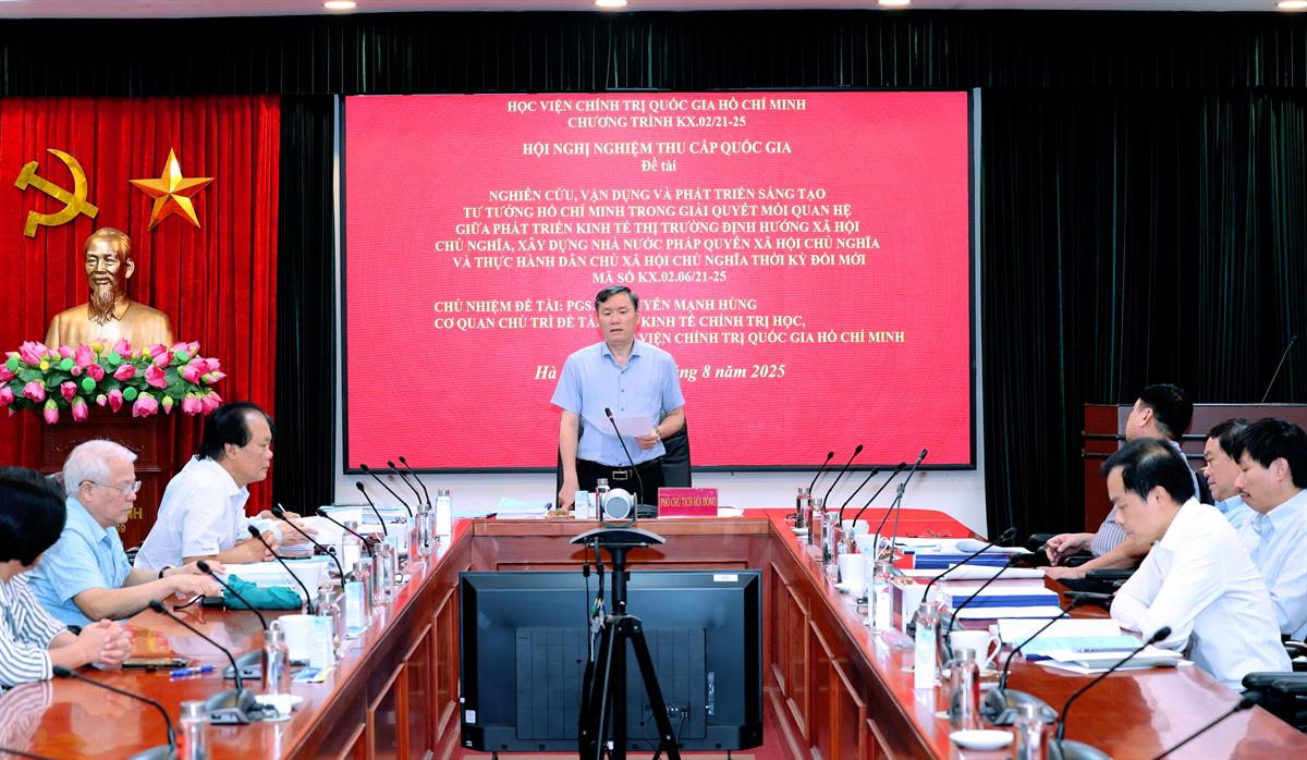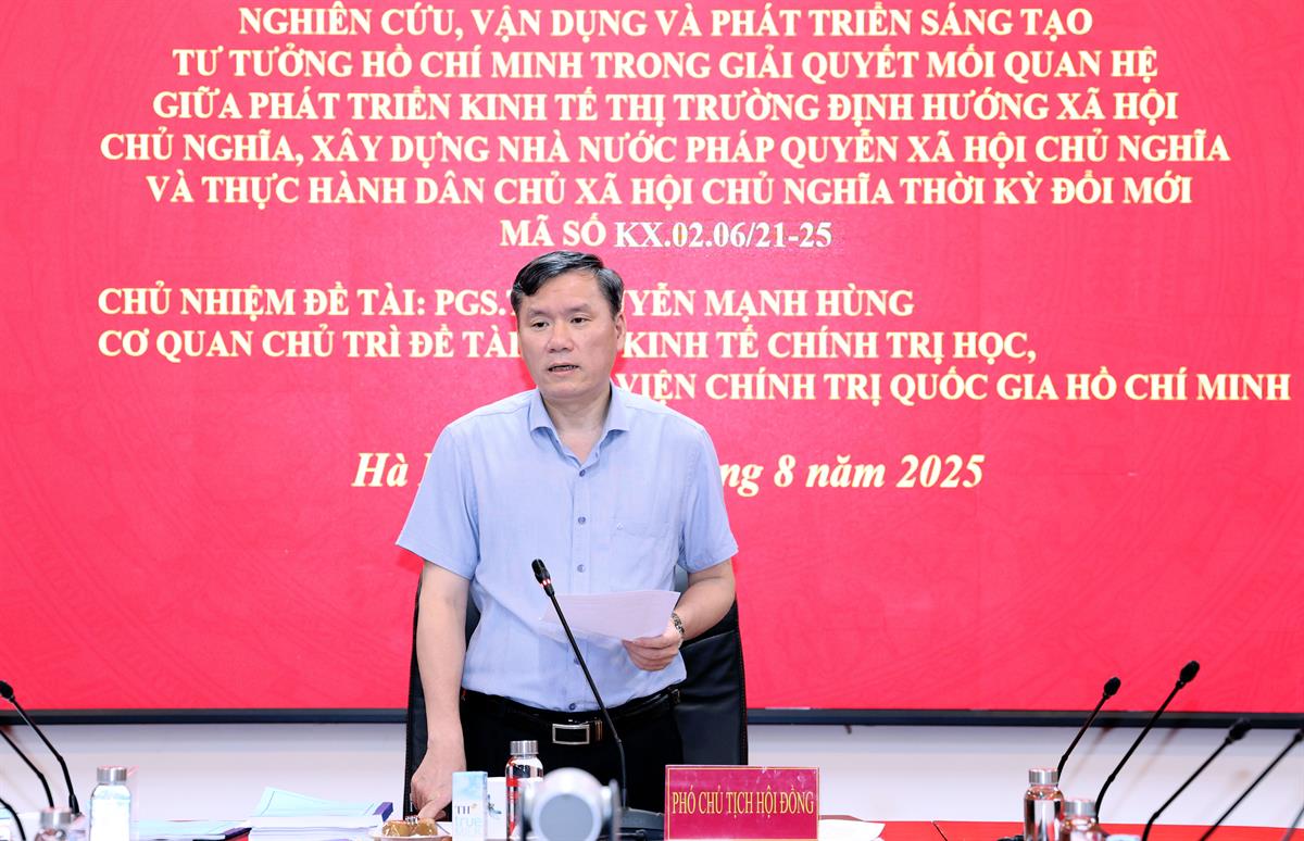 Phát biểu tại Hội nghị, GS,TS Lê Văn Lợi, Phó Giám đốc Học viện Chính trị quốc gia Hồ Chí Minh, Phó Chủ tịch Hội đồng nghiệm thu, nhấn mạnh: Đề tài có ý nghĩa đặc biệt quan trọng về mặt lý luận và thực tiễn trong bối cảnh Đảng ta đang tích cực chuẩn bị các văn kiện trình Đại hội Đảng lần thứ XIV. Việc nghiên cứu sâu sắc, toàn diện và có hệ thống tư tưởng Hồ Chí Minh về mối quan hệ giữa phát triển kinh tế thị trường định hướng xã hội chủ nghĩa, xây dựng Nhà nước pháp quyền xã hội chủ nghĩa và thực hành dân chủ xã hội chủ nghĩa không chỉ góp phần làm rõ thêm nội dung cốt lõi trong đường lối đổi mới của Đảng mà còn cung cấp cơ sở khoa học cho việc hoạch định chủ trương, chính sách phát triển đất nước trong giai đoạn tới.