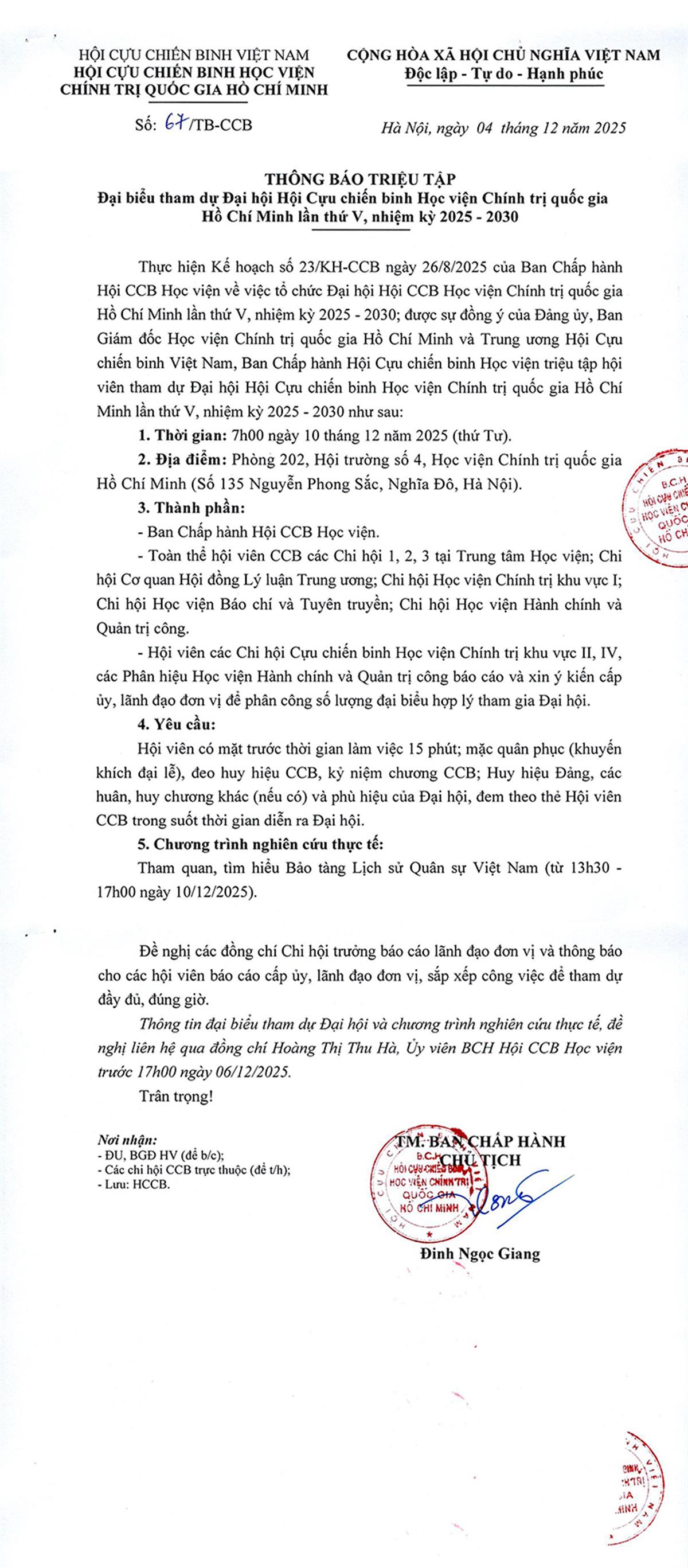 Thông báo số: 67/TB-CCB về việc triệu tập Đại biểu tham dự Đại hội Hội Cựu chiến binh Học viện Chính trị quốc gia Hồ Chí Minh lần thứ V, nhiệm kỳ 2025-2030