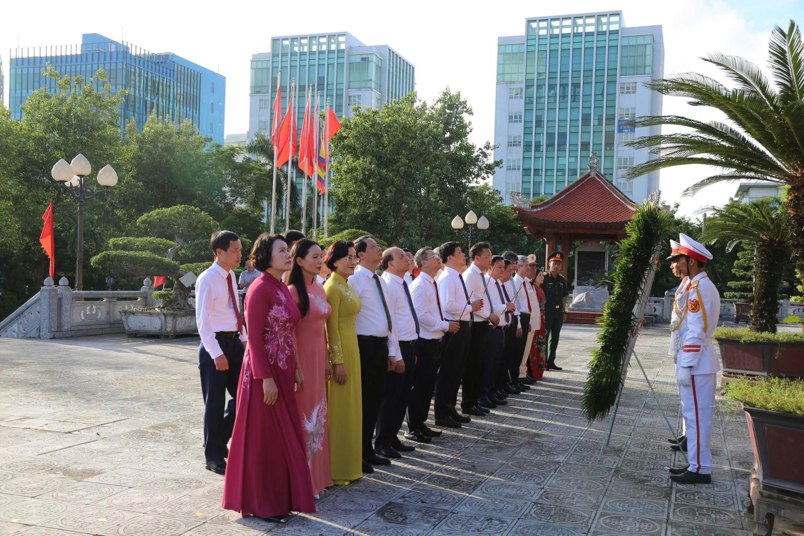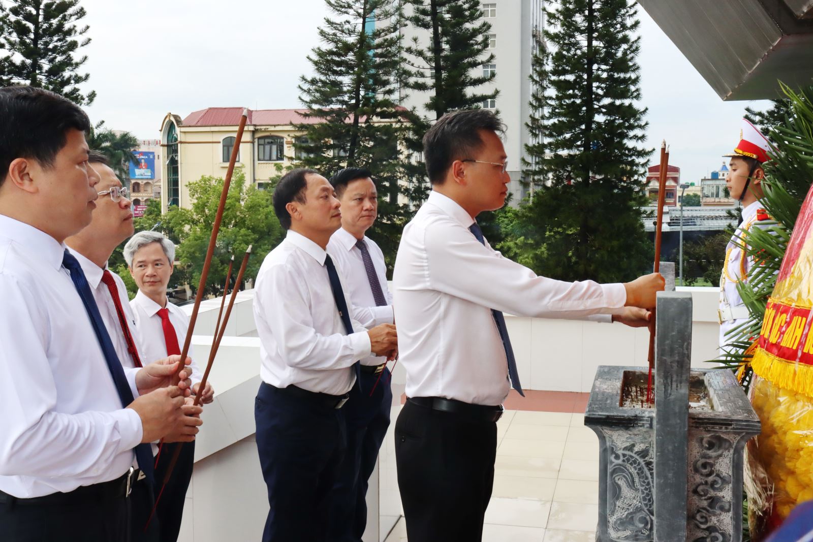 Các đại biểu dâng hương tưởng niệm đồng chí Nguyễn Đức Cảnh tại Tượng đài đồng chí Nguyễn Đức Cảnh, Quảng trường 14/10 (phường Thái Bình)