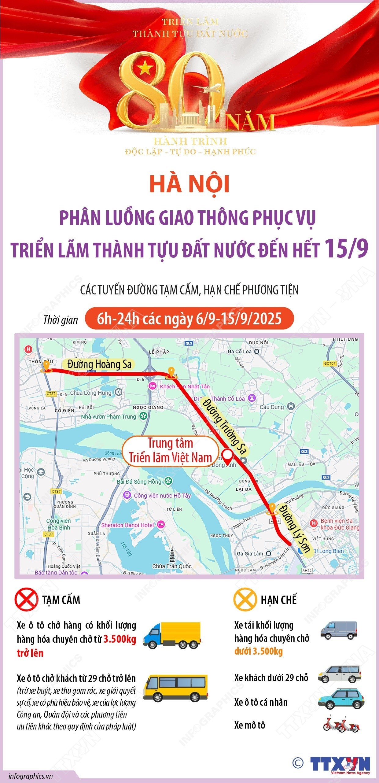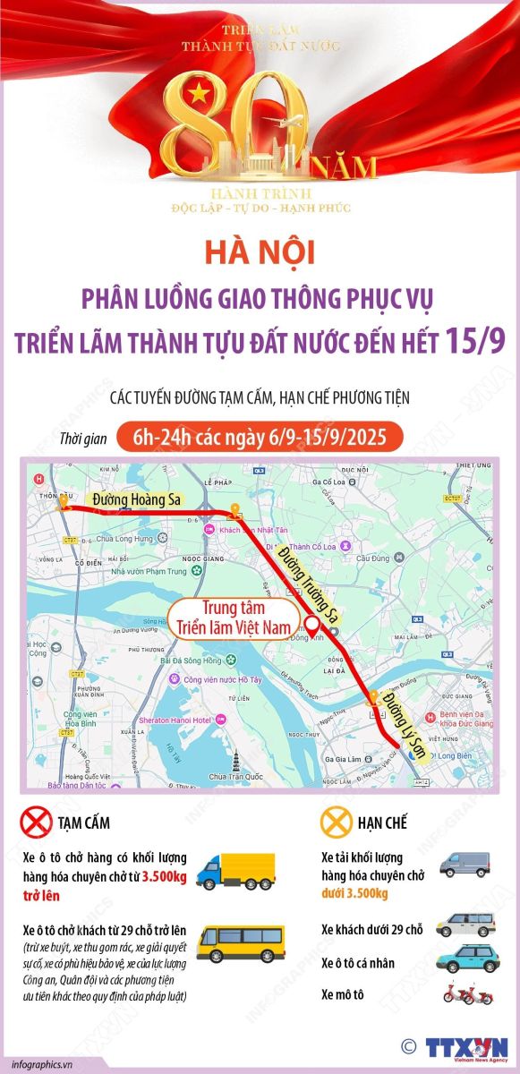 Từ 6h-24h các ngày 6-15/9, Công an thành phố Hà Nội tiếp tục phân luồng giao thông phục vụ Triển lãm Thành tựu đất nước tại Trung tâm Triển lãm Quốc gia (xã Đông Anh, thành phố Hà Nội).