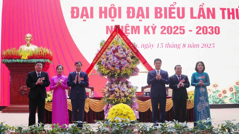Đồng chí Vũ Mạnh Hà - Ủy viên dự khuyết Ban Chấp hành Trung ương Đảng, Phó Bí thư Thường trực Tỉnh ủy tặng hoa chúc mừng đại hội.