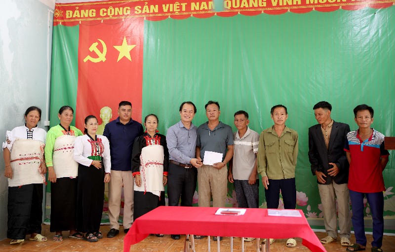 Đồng chí Lầu A Tình - Phó Bí thư Thường trực Đảng uỷ xã Pa Tần tặng quà cho dòng họ "Lò" bản Nậm Sảo 1.