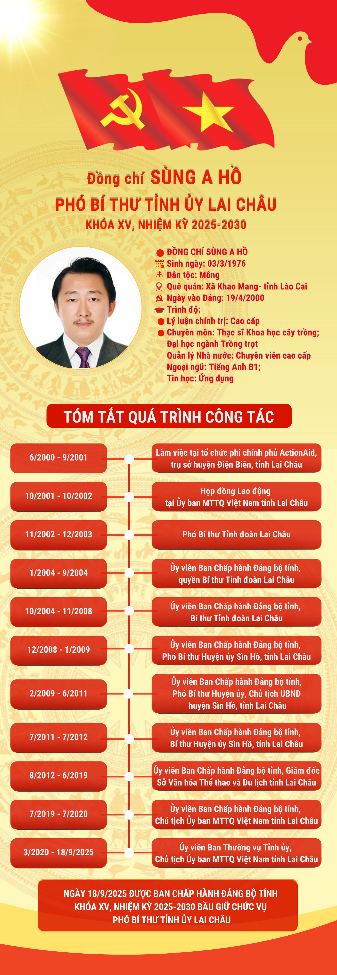 Thứ bảy, 20/09/2025 | 12:57 A- A A+ | Quá trình công tác của đồng chí Sùng A Hồ - Phó Bí thư Tỉnh ủy, Chủ tịch Ủy ban MTTQ Việt Nam tỉnh Lai Châu Minh Huyền - Khánh Thi / baolaichau.vn Bình luận Email* Ý kiến của bạn* Nhập lại Gửi Các tin khác Thông qua Luật Dân số, ưu tiên mua nhà ở xã hội với người có từ 2 con đẻ trở lên Kết luận của Ban Bí thư về nâng cao hiệu quả hoạt động của hệ thống chính trị Ban Chấp hành Đảng bộ xã Than Uyên nhiệm kỳ 2025-2030: Hội nghị lần thứ 10 Quyết tâm cao hơn, dám nói, dám làm, dám chịu trách nhiệm trước đất nước và nhân dân Đặt lợi ích quốc gia, dân tộc lên trên hết trong công tác phòng, chống tham nhũng, lãng phí, tiêu cực Đối thoại trực tiếp giữa người đứng đầu cấp ủy, chính quyền xã Than Uyên với nhân dân bản Hua Than năm 2025