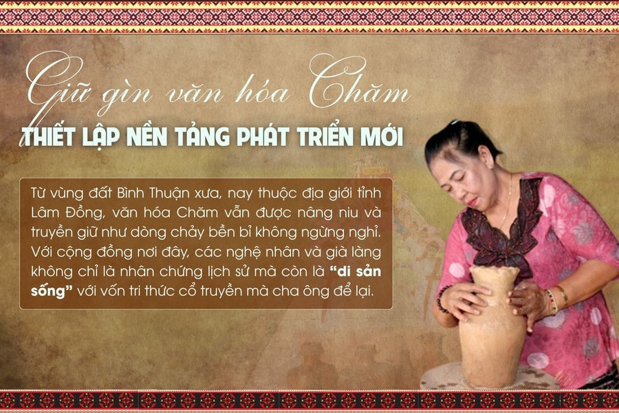 Từ vùng đất Bình Thuận xưa, nay thuộc địa giới tỉnh Lâm Đồng, văn hóa Chăm vẫn được nâng niu và truyền giữ như dòng chảy bền bỉ không ngừng nghỉ. Với cộng đồng nơi đây, các nghệ nhân và già làng không chỉ là nhân chứng lịch sử mà còn là “di sản sống” với vốn tri thức cổ truyền mà cha ông để lại.