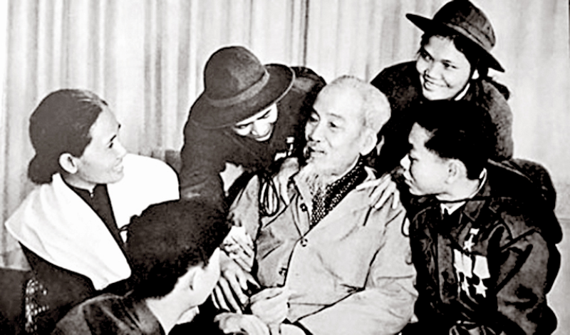 | Bác Hồ với các anh hùng, dũng sĩ miền Nam. Ảnh: TL |