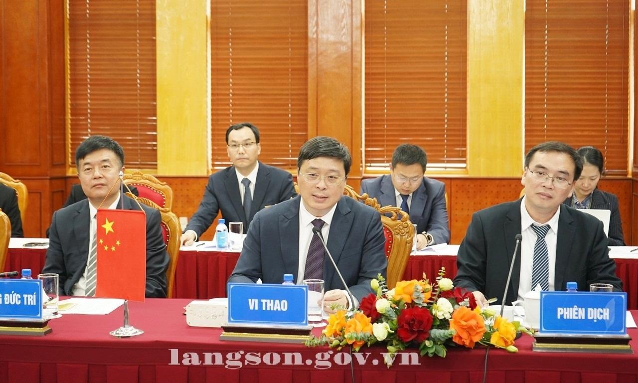Tại hội đàm, đồng chí Nguyễn Cảnh Toàn, Chủ tịch UBND tỉnh bày tỏ vui mừng được đón đồng chí Vi Thao và đoàn đại biểu Khu tự trị dân tộc Choang Quảng Tây đến thăm và làm việc tại Lạng Sơn. Đồng chí nhấn mạnh, thời gian qua trên cơ sở quan hệ đối tác hợp tác chiến lược toàn diện Việt Nam – Trung Quốc, định hướng xây dựng Cộng đồng chia sẻ tương lai Việt Nam – Trung Quốc, hợp tác giữa tỉnh Lạng Sơn và Khu tự trị dân tộc Choang Quảng Tây không ngừng được củng cố, trở thành một trong những điểm sáng, mô hình mẫu mực về hợp tác địa phương giữa hai nước. Các hoạt động giao lưu nhân dân, văn hóa, thể thao, giáo dục, y tế, quản lý biên giới, phòng chống tội phạm diễn ra ngày càng phong phú, hai bên đã mở rộng sang các lĩnh vực mới như chuyển đổi số, cửa khẩu thông minh, logistics, trí tuệ nhân tạo, kinh tế số, hoạt động xuất nhập khẩu hàng hóa được duy trì ổn định, thông suốt, đóng góp đáng kể vào tổng kim ngạch thương mại song phương Việt Nam – Trung Quốc.