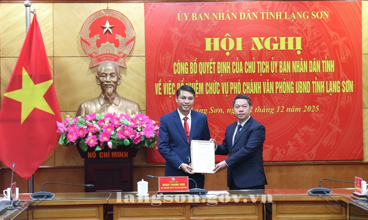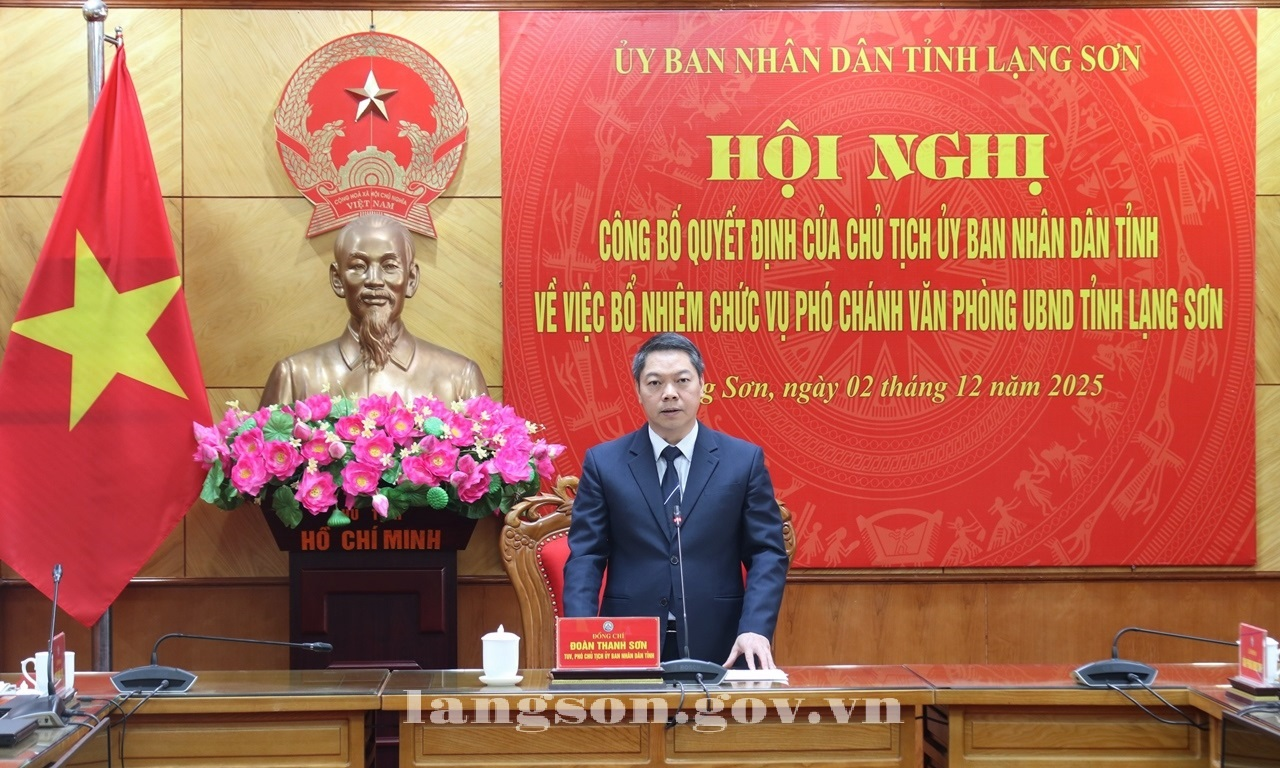 Ngày 02/12/2025, UBND tỉnh tổ chức Hội nghị công bố Quyết định của Chủ tịch UBND tỉnh về việc bổ nhiệm chức vụ Phó Chánh Văn phòng UBND tỉnh. Đồng chí Đoàn Thanh Sơn, Phó Chủ tịch UBND tỉnh dự và trao Quyết định bổ nhiệm.