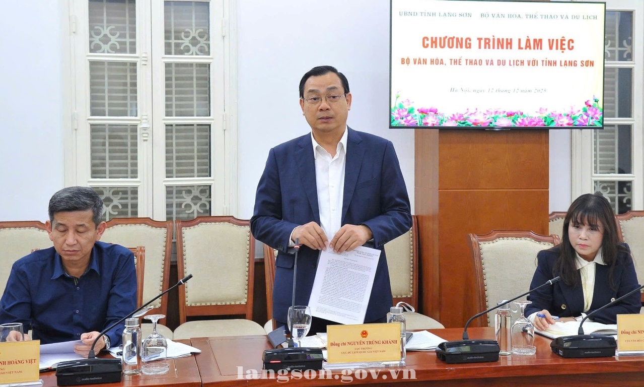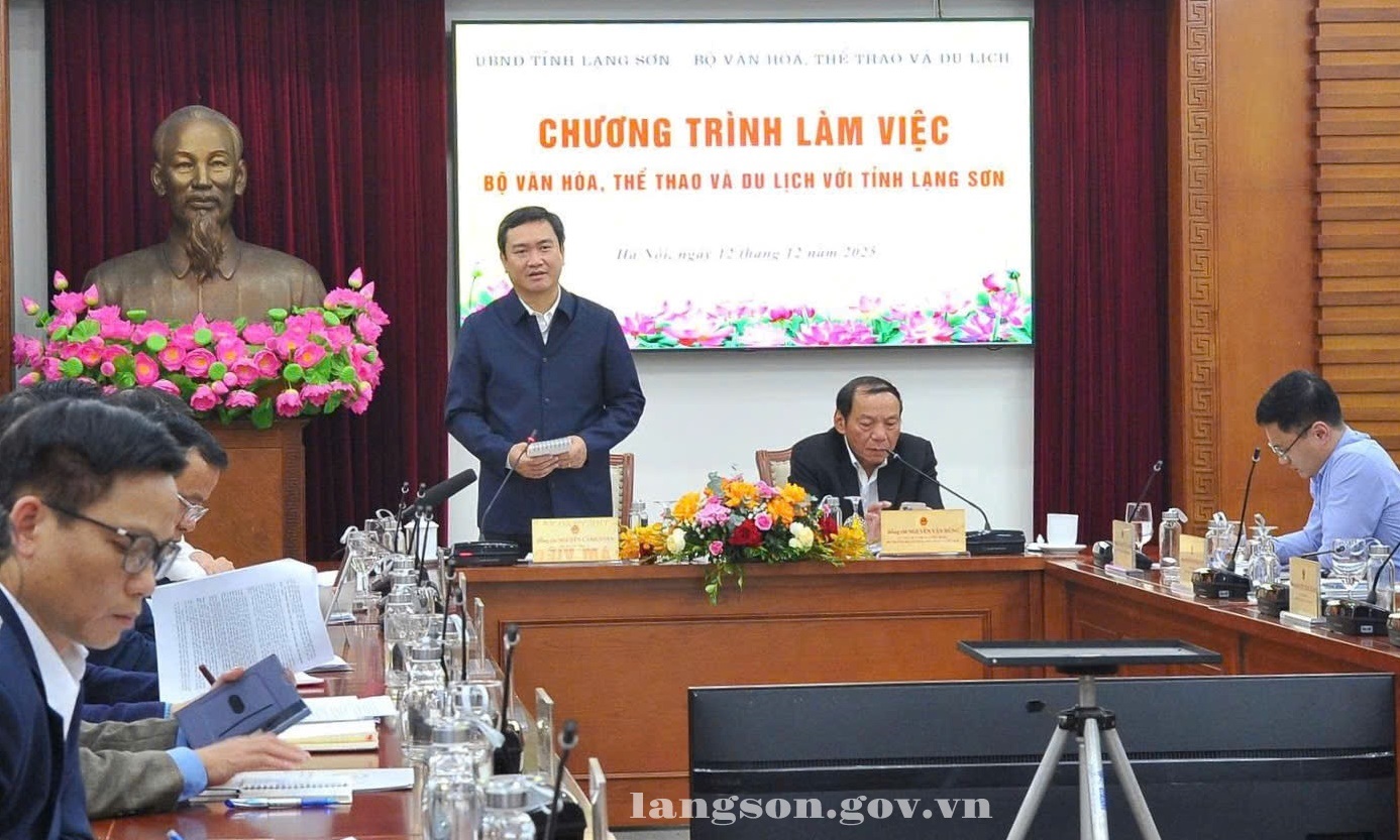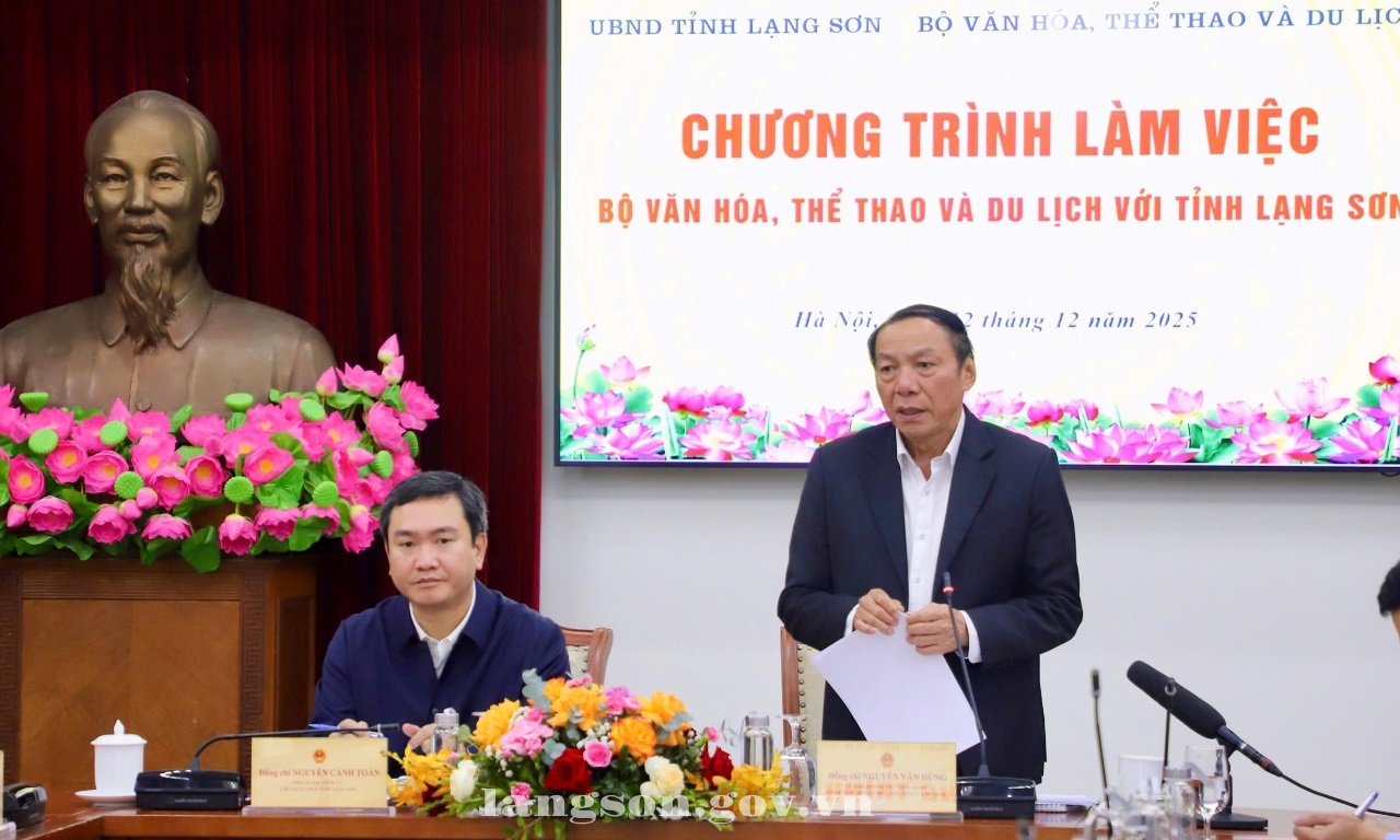 Chiều 12/12/2025, tại Hà Nội, đoàn công tác của UBND tỉnh Lạng Sơn, do đồng chí Nguyễn Cảnh Toàn, Phó Bí thư Tỉnh ủy, Chủ tịch UBND tỉnh làm Trưởng đoàn đã có buổi làm việc với đồng chí Nguyễn Văn Hùng, Ủy viên Ban Chấp hành Trung ương Đảng, Bộ trưởng Bộ Văn hóa, Thể thao và Du lịch (VHTT&DL) về kết quả thực hiện công tác văn hóa, thể thao và du lịch năm 2025; đề xuất Chương trình mục tiêu quốc gia về phát triển văn hóa giai đoạn 2025-2035 trên địa bàn tỉnh Lạng Sơn.