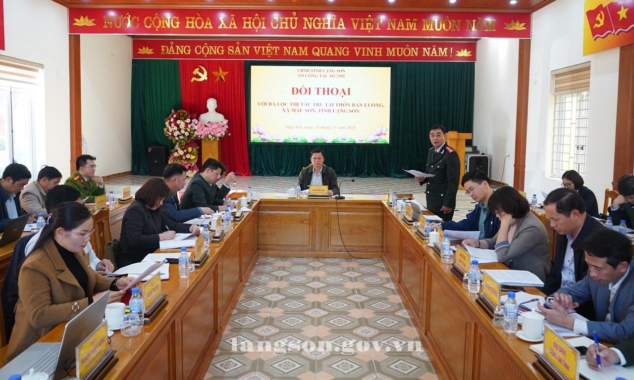Chiều 24/11/2025, tại Trụ sở UBND xã Mẫu Sơn, đồng chí Đinh Hữu Học, Phó Chủ tịch Thường trực UBND tỉnh, Tổ phó Thường trực Tổ công tác rà soát, xử lý, giải quyết các vụ việc khiếu nại, tố cáo phức tạp về an ninh, trật tự trên địa bàn tỉnh Lạng Sơn (theo Quyết định số 2305/QĐ-UBND) đã chủ trì buổi đối thoại với bà Lộc Thị Tầu để thông tin công khai đến bà về kết quả các nội dung bà yêu cầu giải quyết.