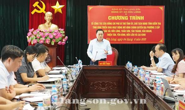 Ngày 04/8/2025, đồng chí Hồ Tiến Thiệu, Phó Bí thư Tỉnh ủy, Chủ tịch UBND tỉnh đã kiểm tra tình hình triển khai hoạt động mô hình chính quyền địa phương 2 cấp tại các xã: Hữu Lũng, Tuấn Sơn, Tân Thành, Vân Nham, Thiện Tân, Yên Bình, Hữu Liên và Cai Kinh.