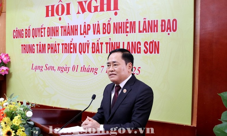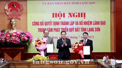 Chiều ngày 01/7/2025, UBND tỉnh tổ chức Hội nghị công bố quyết định thành lập và bổ nhiệm lãnh đạo Trung tâm phát triển quỹ đất tỉnh Lạng Sơn. Dự Hội nghị có đồng chí Hồ Tiến Thiệu, Phó Bí thư Tỉnh ủy, Chủ tịch UBND tỉnh; đồng chí Lương Trọng Quỳnh, Phó Chủ tịch UBND tỉnh.