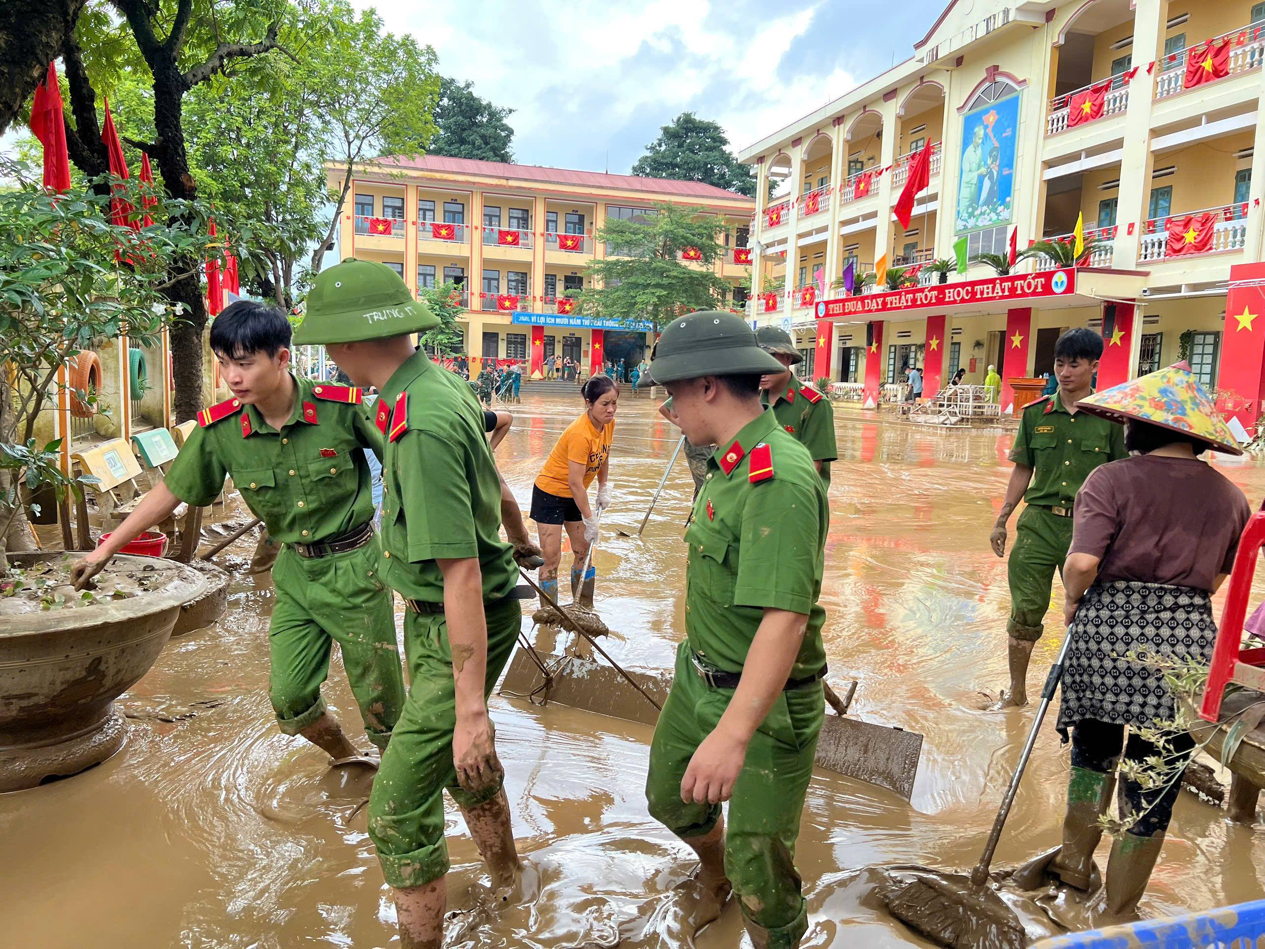 Nỗ lực khắc phục hậu quả bão số 10, sau khi nước rút tại trường THCS Mỏ Vàng, xã Mỏ Vàng, tỉnh Lào Cai.