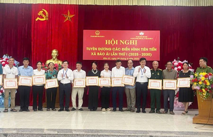 Tại hội nghị này UBND xã Bảo Ái đã trao tặng Giấy khen cho 15 tập thể và 13 cá nhân có thành tích suất sắc trong phong trào thi đua giai đoạn 2020-2025 (ảnh trên).