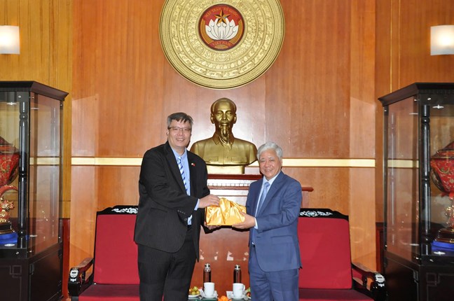 | Chủ tịch Ủy ban Trung ương MTTQ Việt Nam Đỗ Văn Chiến nhận quà lưu niệm từ TS Trần Hải Linh, Ủy viên Ủy ban Trung ương MTTQ Việt Nam, Chủ tịch Hiệp hội Doanh nhân Đầu tư Việt Nam – Hàn Quốc |