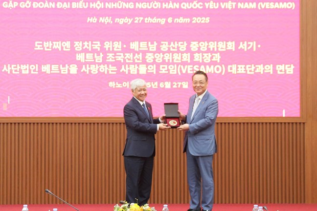 (Mặt trận) - Chiều 27/6, tại Hà Nội, ông Đỗ Văn Chiến, Ủy viên Bộ Chính trị, Bí thư Trung ương Đảng, Chủ tịch UBTƯ MTTQ Việt Nam đã gặp gỡ đoàn đại biểu Hội những người Hàn Quốc yêu Việt Nam (VESAMO) do ông Chang Ho Ick, Phó Chủ tịch Tập đoàn Dongwon, Phó Chủ tịch Phòng Thương mại và Công nghiệp thành phố Busan, Chủ tịch VESAMO dẫn đầu, sang thăm và làm việc tại Việt Nam.