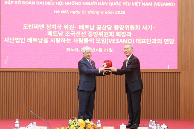 | Chủ tịch Đỗ Văn Chiến nhận quà lưu niệm từ Đoàn đại biểu Hội những người Hàn Quốc yêu Việt Nam (VESAMO) trao tặng |