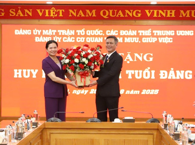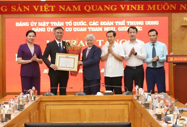 | Đồng chí Đỗ Văn Chiến, Ủy viên Bộ Chính trị, Bí thư Trung ương Đảng, Bí thư Đảng ủy MTTQ, các đoàn thể Trung ương, Chủ tịch Ủy ban Trung ương MTTQ Việt Nam trao Huy hiệu 30 năm tuổi Đảng cho đồng chí Trần Thắng, Phó Bí thư Đảng ủy MTTQ, các đoàn thể Trung ương. |