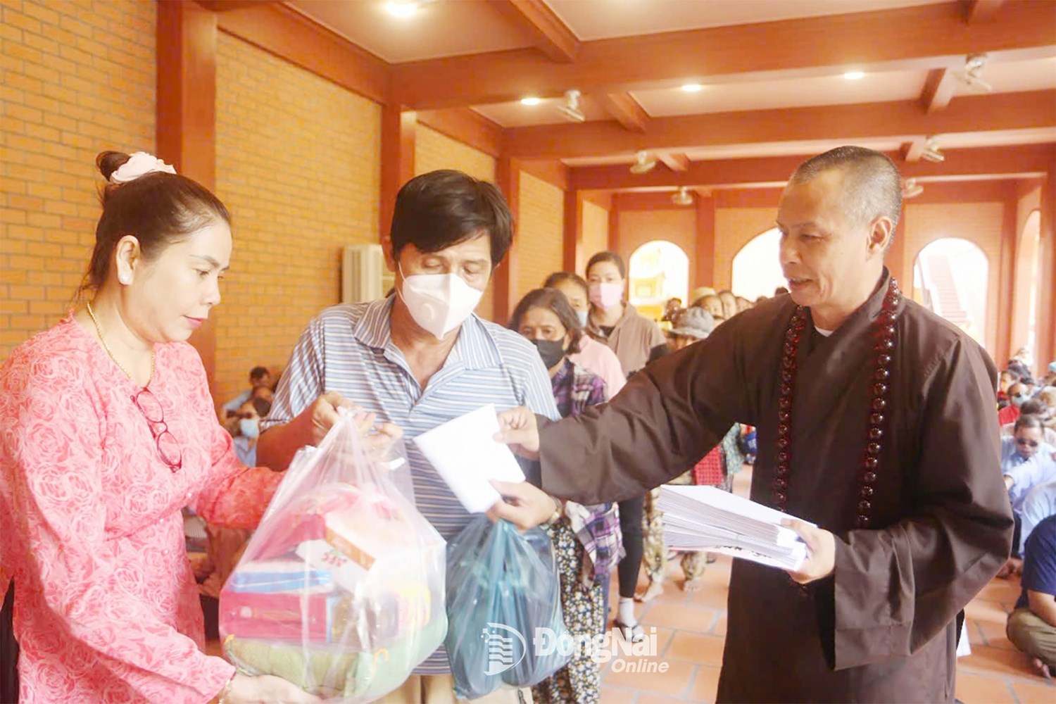 Người khuyết tật nhận quà do chùa Phúc Lâm (phường Tam Hiệp) hỗ trợ. Ảnh: Văn Truyên