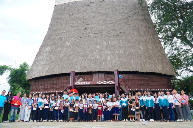 | Kiều bào trẻ tham quan nhà rông truyền thống ở phường Kon Tum |