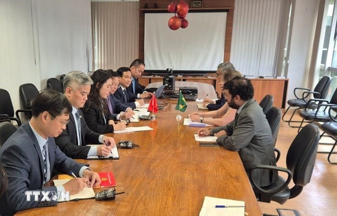 | Đoàn công tác của Ban Chính sách Chiến lược Trung ương Đảng do ông Nguyễn Đức Hiển, Phó Trưởng ban dẫn đầu và Đại sứ Bùi Văn Nghị làm việc với Cơ quan Hợp tác (ABC) của Bộ Ngoại giao Brazil. (Ảnh: TTXVN phát) |