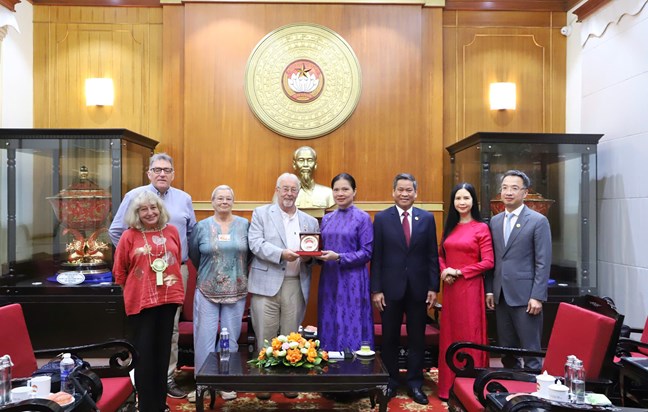 | Bà Hà Thị Nga, Ủy viên Trung ương Đảng, Phó Chủ tịch Ủy ban Trung ương MTTQ Việt Nam chụp ảnh lưu niệm cùng Bí thư Đảng Cộng sản Anh Robert Griffiths |