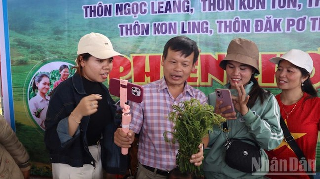 | Lãnh đạo xã Tu Mơ Rông giới thiệu hàng nông sản tại Phiên chợ 0 đồng |