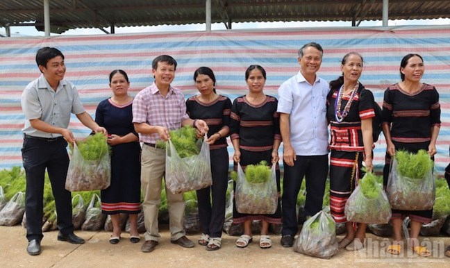 | Lãnh đạo xã trao cây giống cho bà con các thôn |