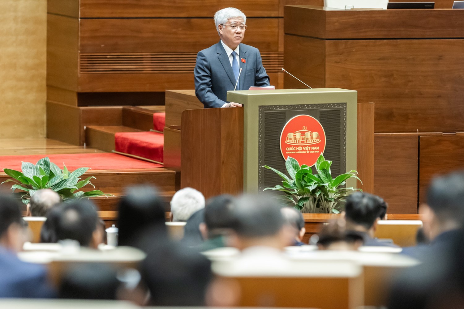 | Ông Đỗ Văn Chiến, Ủy viên Bộ Chính trị, Bí thư Trung ương Đảng, Chủ tịch Ủy ban Trung ương Mặt trận Tổ quốc Việt Nam trình bày Báo cáo một số nội dung chủ yếu tổng hợp ý kiến, kiến nghị của cử tri và Nhân dân cả nước gửi tới Kỳ họp thứ Mười, Quốc hội khóa XV. Ảnh: Quang Vinh |