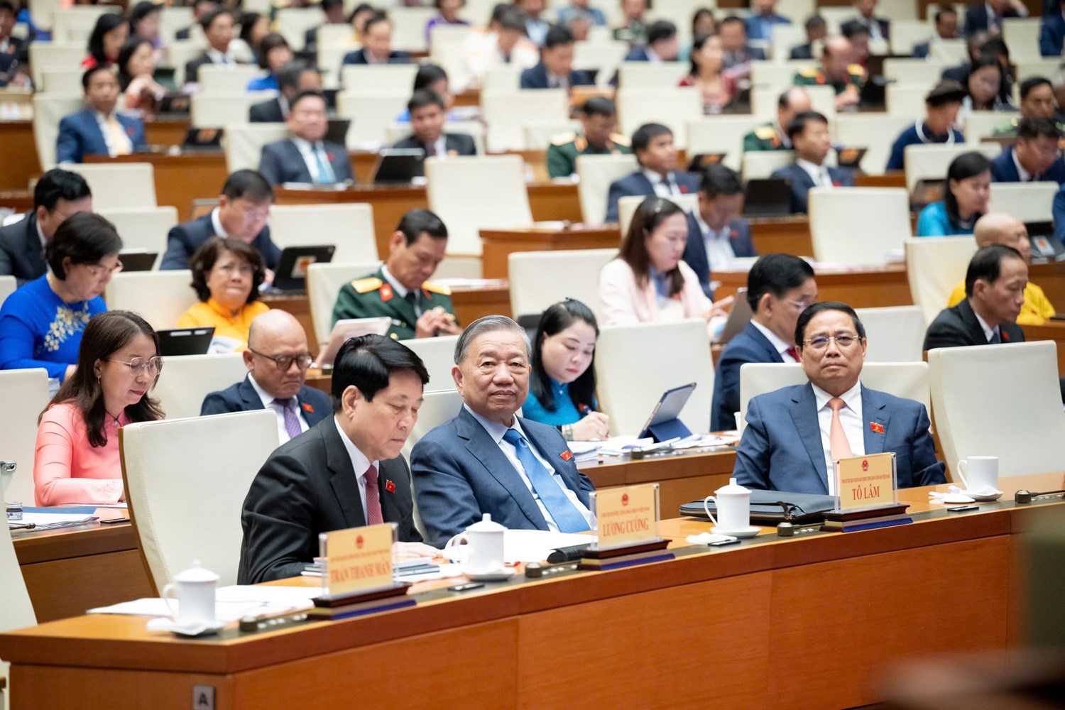 | Tổng Bí thư Tô Lâm, Chủ Tịch nước Lương Cường, Thủ tướng Chính phủ Phạm Minh Chính tham dự Phiên Khai mạc Kỳ họp. Ảnh: Quang Vinh |