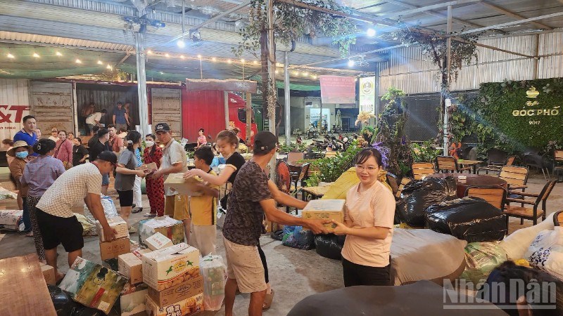 | Người dân mang nhu yếu phẩm đến điểm tập kết tại Câu lạc bộ thiện nguyện Từ Ái, phường Trung An, tỉnh Đồng Tháp để hỗ trợ cho nhân dân vùng lũ miền Bắc và miền Trung |