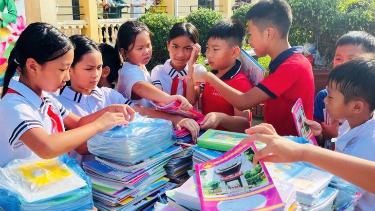 | Các em học sinh xã Tứ Kỳ tập hợp sách giáo khoa, vở viết, dụng cụ học tập trước khi chuyển lên xe hỗ trợ. (Ảnh: LINH LINH) |