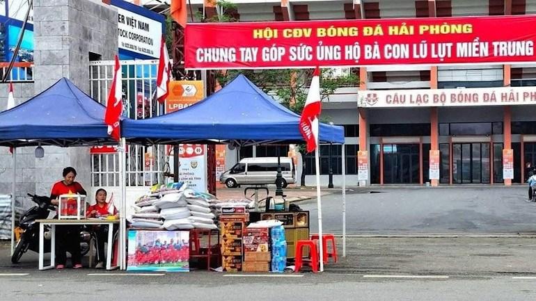 | Một điểm tiếp nhận nhu yếu phẩm ủng hộ đồng bào miền trung bị lũ lụt do Hội Cổ động viên bóng đá Hải Phòng tổ chức |