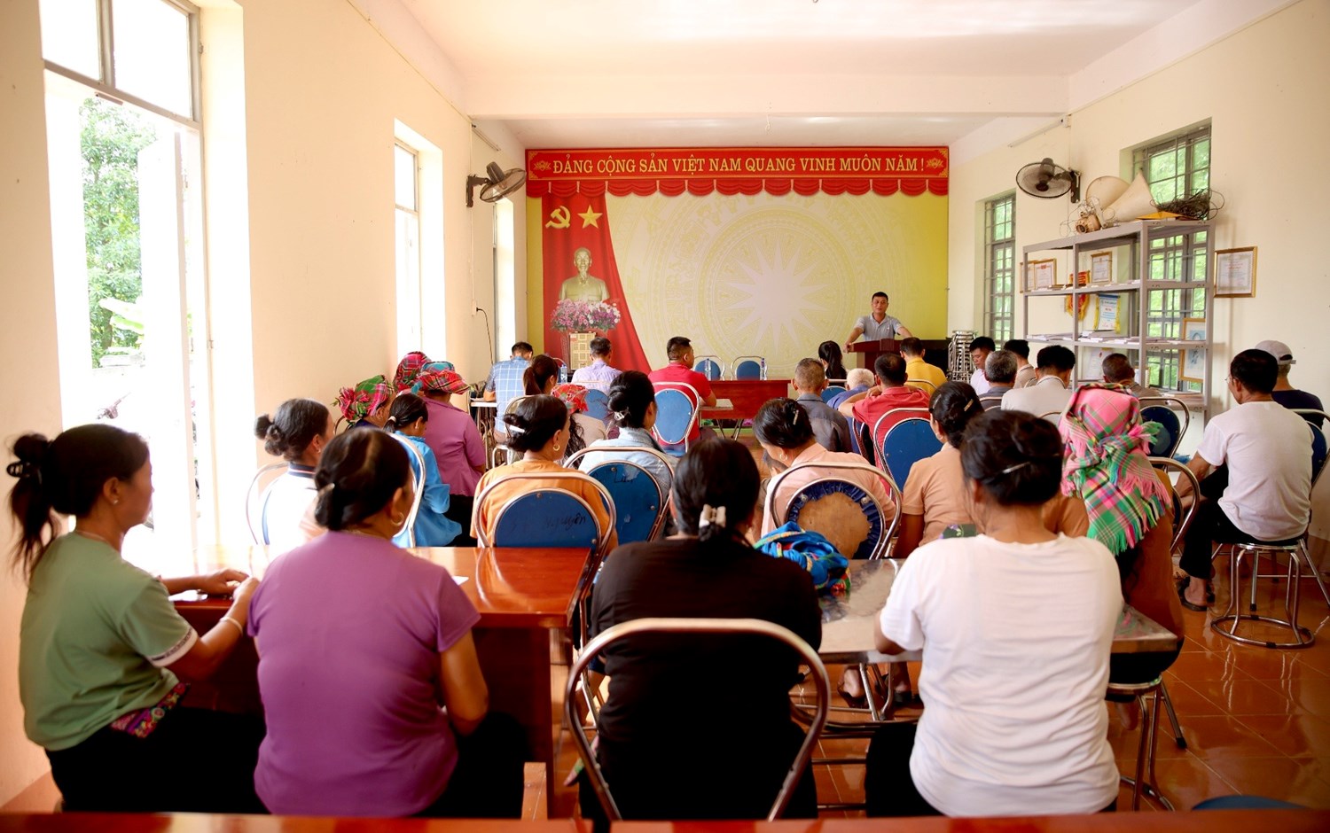 | Cán bộ bản Vi (xã Mường Kim) tuyên truyền phong trào “Bình dân học vụ số” tới người dân |