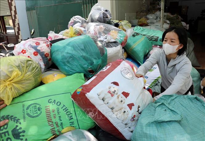 Rất nhiều vật phẩm được người dân mang tới các điểm tiếp nhận ủng hộ của Câu lạc bộ Thiện nguyện trẻ Thái Bình để chuyển tới đồng bào vùng lũ. Ảnh: Thế Duyệt/TTXVN