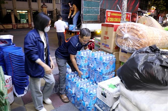 Thành viên Câu lạc bộ Tình nguyện Thái Bình vận chuyển các vật phẩm lên xe để mang đến đồng bào vùng lũ. Ảnh: Thế Duyệt/TTXVN