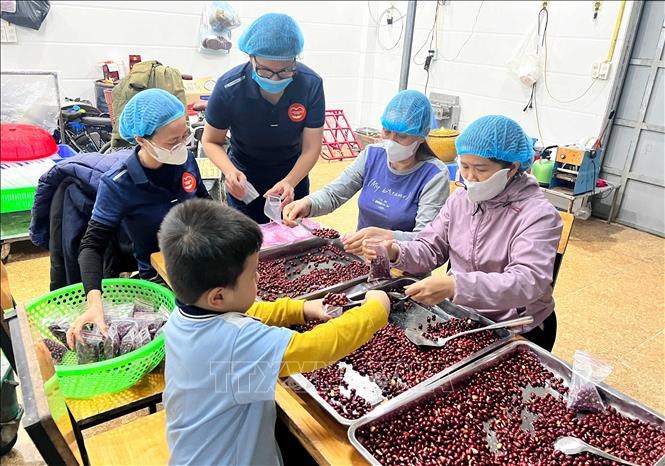 Thành viên Câu lạc bộ Tình nguyện Thái Bình chuẩn bị các loại thực phẩm để chuyển đến đồng bào vùng lũ. Ảnh: Thế Duyệt/TTXVN