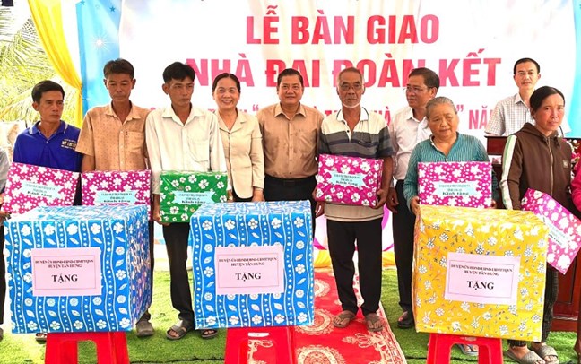 | Cán bộ các xã Tân Hưng và người dân tham dự lễ bàn giao nhà đại đoàn kết |