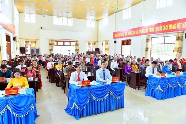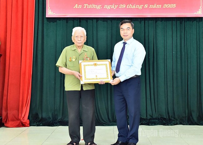 | Ông Ma Thế Hồng, Phó Bí thư Tỉnh ủy, Chủ tịch Ủy ban MTTQ Việt Nam tỉnh Tuyên Quang trao huy hiệu 70 năm tuổi Đảng cho cụ Đặng Thị Sáu, Chi bộ thôn Cầu Kỳ |