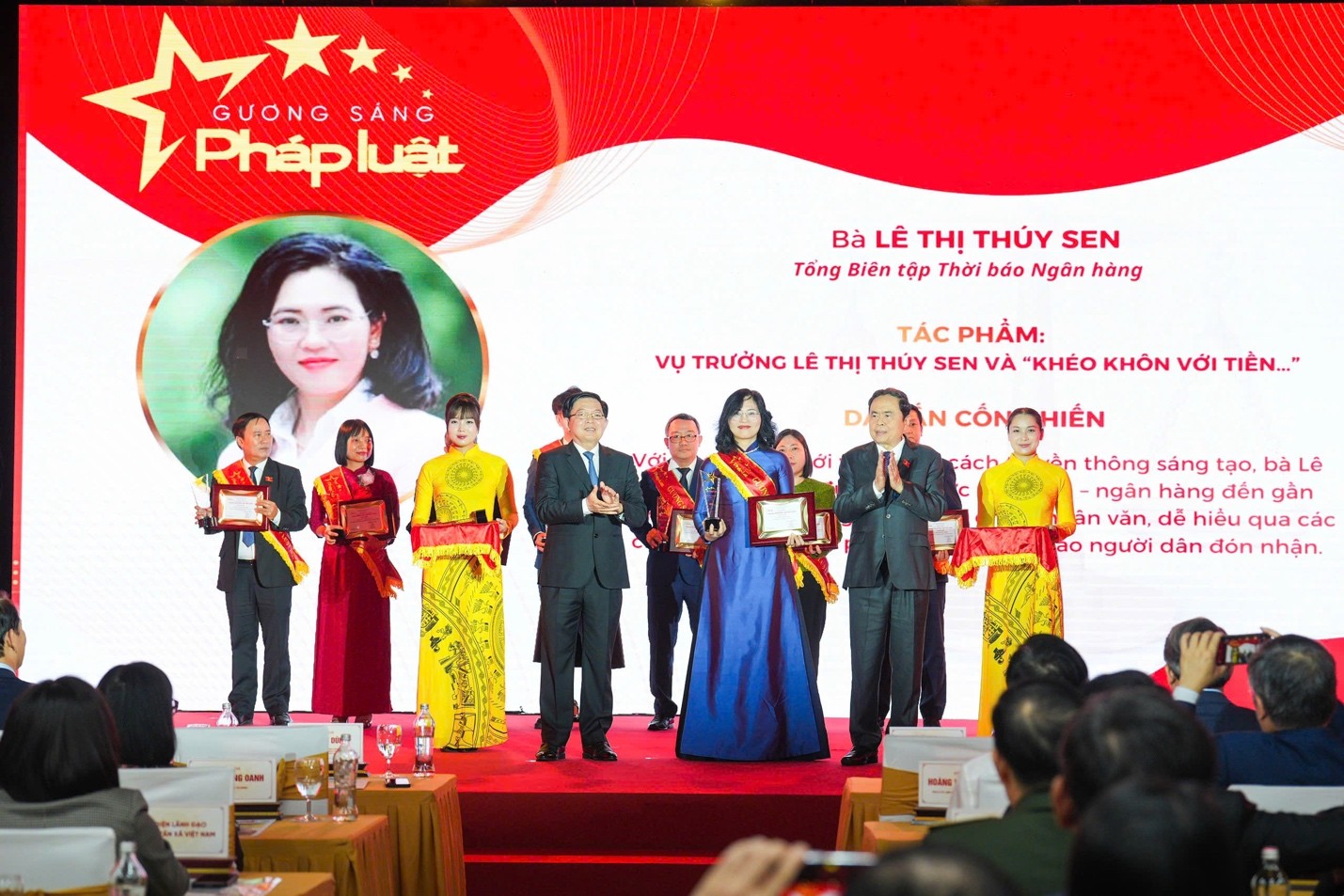 Trong lĩnh vực tài chính, ngân hàng, bà Lê Thị Thúy Sen, Tổng biên Tập Thời báo Ngân hàng là một trong số những cá nhân tiêu biểu được vinh danh là “Gương sáng Pháp luật” lần này. Thông qua cuốn sách “Khéo khôn với tiền, tránh những ưu phiền” và bộ sách “Giáo dục Tài chính” dành cho học sinh lớp 1-12 vừa được xuất bản 09/2025 được biên soạn dễ hiểu, dễ nhớ, dễ tiếp thu thông qua tranh vẽ hãy các ca dao, tục ngữ bà Lê Thị Thúy Sen đã góp phần quan trọng vào sự nghiệp xây dựng Nhà nước pháp quyền xã hội chủ nghĩa Việt Nam, đảm bảo sự ổn định và an toàn về tài chính cho cộng đồng. Đóng góp nổi bật và trực tiếp liên quan đến sự nghiệp xây dựng và thi hành pháp luật chính là cuốn sách “Khéo khôn với tiền, tránh những ưu phiền” và Bộ sách “Giáo dục Tài chính” dành cho học sinh. Các ấn phẩm này được đánh giá cao vì đã góp phần nâng cao dân trí tài chính một cách hiệu quả, từ đó tạo nền tảng vững chắc cho việc thượng tôn pháp luật và đảm bảo trật tự xã hội. Các kiến thức cơ bản về quản lý tiền, đầu tư, tiết kiệm và vay vốn được truyền tải trong sách giúp người dân, đặc biệt là thế hệ trẻ, có đủ hiểu biết để tự bảo vệ quyền lợi hợp pháp của mình. Đây là một hình thức phổ biến pháp luật gián tiếp nhưng vô cùng thiết thực.