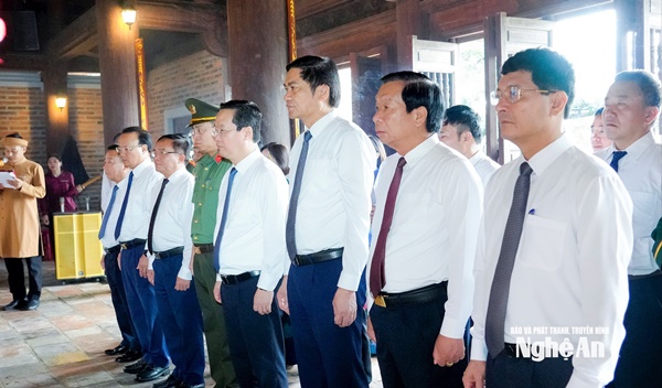 Trước đó, Đoàn đại biểu Tỉnh ủy, HĐND, UBND, Ủy ban MTTQ Việt Nam tỉnh Nghệ An đã tổ chức dâng lễ, dâng hoa, dâng hương tưởng niệm tại đền Chung Sơn - đền thờ gia tiên Chủ tịch Hồ Chí Minh.